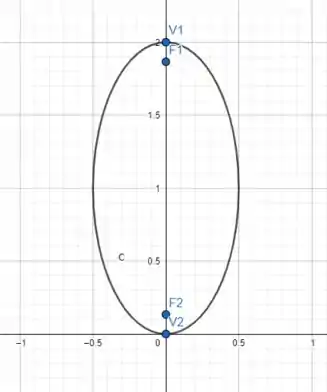 em que e são as coordenadas do centro da elipse. Nós podemos obter os vértices horizontais com , e os vértices verticais com . Finalmente, os focos podem ser obtidos utilizando a seguinte relação: