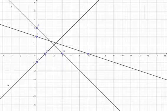 b) No desenho abaixo podemos ver que não existe um ponto em que as 3 retas se intersectem, donde concluímos que o sistema não possui solução.