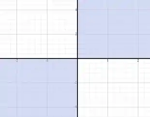 - A equação dada apresenta uma restrição de que o produto . Lembre-se que para que o produto seja positivo ambos os termos devem ter o mesmo sinal, ou seja, e , logo todos os valores que estão no 1° e 3° quadrante satisfazem a condição, como mostra a figura abaixo