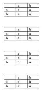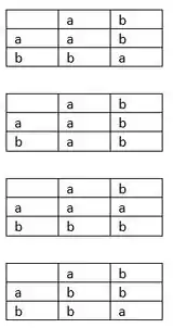 Precisamos construir as tábuas de operações igual foi aprendido nesse capítulo, para um conjunto com dois elementos, ou seja, teremos possibilidades de resposta!