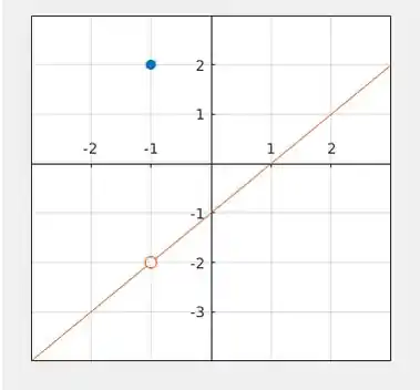 O gráfico será composto de duas partes. Mais especificamente, será um gráfico completo com uma descontinuidade nele. E no ponto de descontinuidade teremos um ponto em . Além disso, outra coisa que podemos fazer para facilitar a construção de nosso gráfico é simplificar a função.