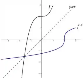 - Para traçar o gráfico de , normalmente, acharíamos a função inversa e depois iríamos traçar o gráfico. Como já temos o gráfico da função , não há necessidade de fazermos estes cálculos. Vamos pegar todos os pontos importantes e fáceis de achar (os pontos das extremidades da curva e os que interceptam o eixo ou o eixo ) e encontrar os pontos simétricos apenas invertendo a ordem dos números. Vamos começar pelos pontos das extremidades