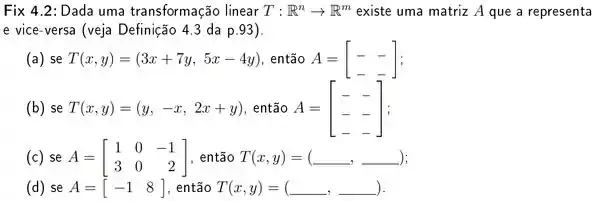 Assim, manipulando a matriz, temos que e pronto, é só repetir essa mesma estratégia para resolver as matrizes das outras transformações lineares.