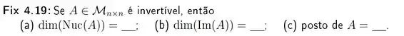 - Como descobrir a dimensão do núcleo de A, sendo que ? A primeira coisa é perceber que o comando diz que a A é invertível, ou seja, possui função inversa, se, e somente se, ela for bijetora que é uma função injetora, ou seja, todo elemento da imagem possui um único correspondente no domínio. Até aqui, tudo beleza, né? O importante nesse passo é lembrar do teorema que diz que A para ser invertível tem que satisfazer a condição de ter e, consequentemente, a dimensão