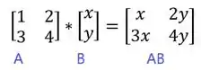 - De acordo com a propriedade de multiplicação de matrizes de que as colunas de AB são produto matriz-vetor (linhas) de A com colunas de B, assim como mostrado no exemplo abaixo: