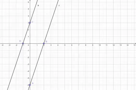 Sejam e as retas dadas pelas equações e , respectivamente. Inicialmente, iremos determinar dois pontos de cada uma dessas retas para podermos desenha-las.