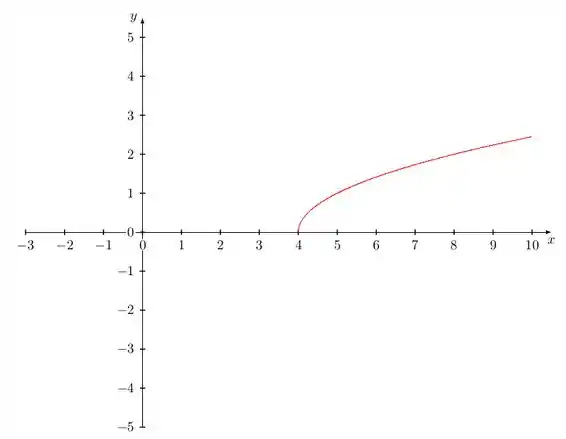 Essa é a equação de uma parábola, mas com a concavidade num sentido não convencional, ou seja, ela será para a direita. E ainda temos um “porém” aí nessa figura, porque a equação original envolve a raiz quadrada de um termo em , o que limita nosso domínio. Logo, teremos que desenhar uma “parábola deitada” que comece no ponto .