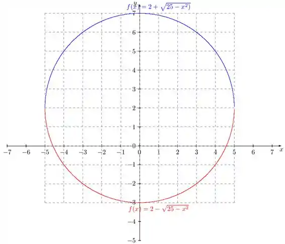 Estes passos são necessários para evidenciarmos alguns pontos. Primeiro, ao tirarmos uma raiz quadrada de um termo elevado ao quadrado, obtemos seu módulo. Isso nos conduz a uma resposta do tipo “”. Segundo, não podemos traçar o gráfico de uma circunferência de uma vez só porque isso iria contra a regra da “reta vertical”. Logo, a nossa solução é traçar a metade positiva e a metade negativa e juntar as duas. Isso é mostrado na figura abaixo com uma cor para cada equação: