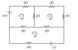 Considere o circuito a seguir com resistências e baterias tal como indicado; escolhemos arbitrariamente as correntes e os valores da malha: