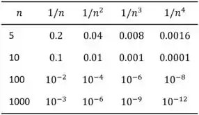 b. Faça uma tabela listando 1/n, 1/n2, 1/n3 e 1/n4 para n = 5, 10, 100 e 1000 e discuta o