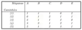 Uma transportadora possui tipos de caminhões que representaremos por , os quais são equipados para transportar tipos diferentes de máquinas segundo a Tabela abaixo, onde supomos que é a quantidade de máquinas que cada caminhão pode transportar levando carga plena.