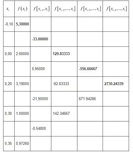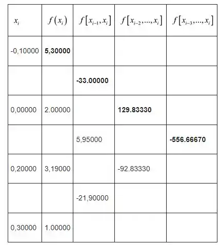 Construa a tabela de diferenças divididas de newtons usando a seguinte expressão