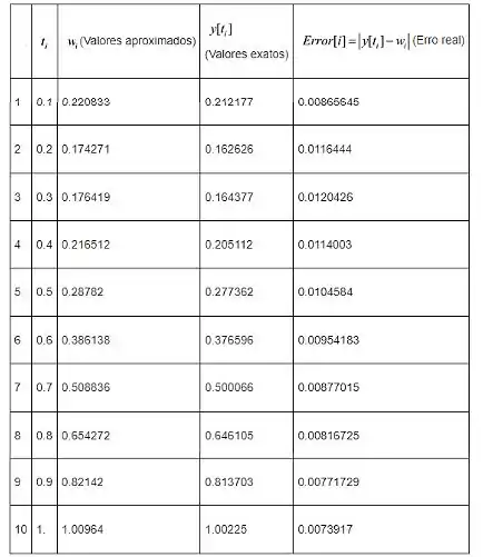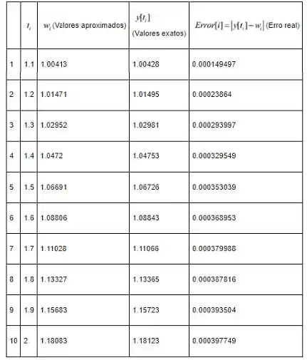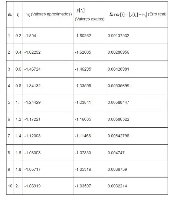 A tabela mostrada a seguir fornece a comparação entre a solução aproximada e a solução exata