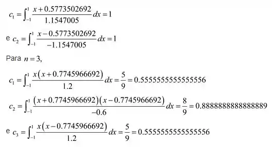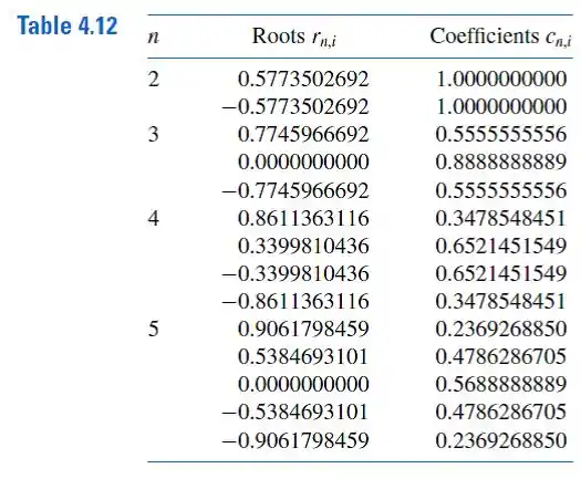 Verifique as entradas para os valores de n = 2 e 3 na Tabela 4.12 na página 232 encontrando as raízes do respectivos polinômios de Legendre, e use as equações que precedem esta tabela para encontrar os coeficientes associados aos valores.