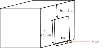 Exemplo: Uma porta com de largura e de altura está localizada em uma parede vertical, plana, de um tanque de água. A porta é articulada ao longo de sua borda superior, que fica abaixo da superfície da água. A pressão atmosférica atua na superfície da porta. Se a pressão na superfície da água for a atmosférica, que força deve ser aplicada na borda inferior da porta a fim de impedi-la de abrir?