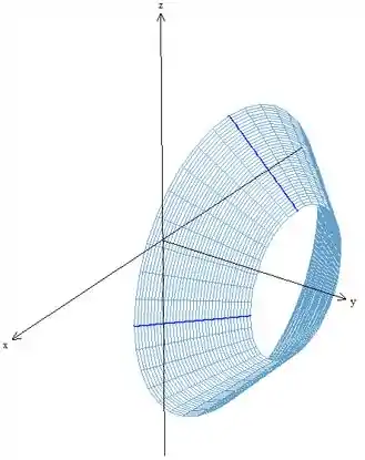Já sabemos que, quando aparecer essa história de rodar uma função em torno de algum eixo, estamos tratando de superfície de revolução né? Essa está rodando em torno do eixo , portanto vamos colocar aquele fator de giro nos eixos e .
