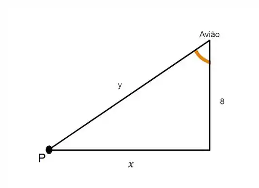 Temos que o segmento de reta com tamanho x é nossa “terra plana”, enquanto a altura é a altura do avião acima do solo (8 milhas) e y é nossa distância entre P e o avião.