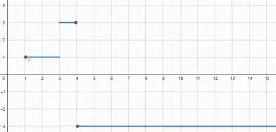 O rascunho do gráfico pode ser dado analisando o eixo das abscissas como e das ordenadas como . Para todo valor menor que , a função será constante em Para valores de entre 1 e 3, a função se comporta de maneira constante em 1. Para valores entre 3 e 4, a função é constate em 3, e para valores maiores que a função será constante em .
