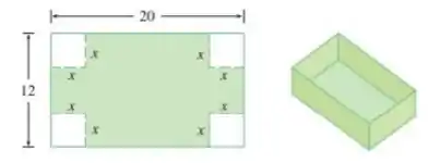 Uma caixa sem tampa deve ser construída de um pedaço retangular de papelão com dimensões cm por cm. Para isso, deve-se cortar quadrados de lados x de cada canto e depois dobrar, conforme mostra a figura. Expresse o volume V da caixa como uma função de x.