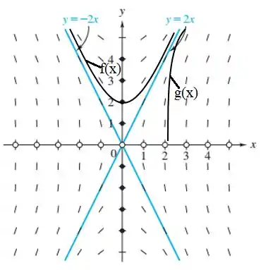 - As curvas de solução tornam-se infinitas quando x→∞ e têm a linha y=2 como assíntota. A curva solução da parte (a) torna-se infinita e tem a linha y=−2 como assíntota quando x→−∞. A curva de solução da parte (b) não existe para x negativo.