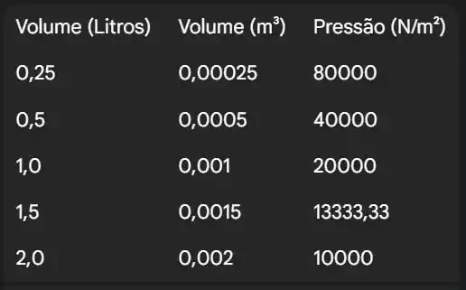 (c) Faça uma tabela que mostre as pressões para volumes de 0,25, 0,5, 1, 1,5 e 2 litros