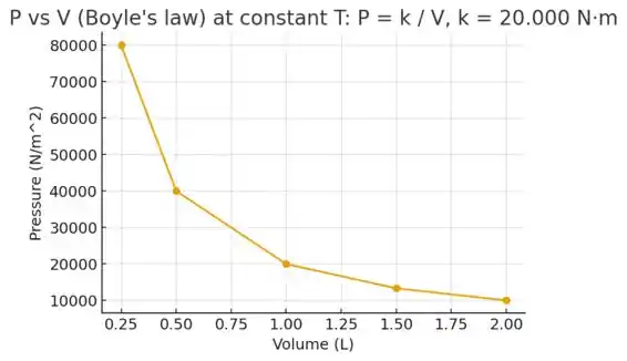 Conforme discutido nesta seção, a lei de Boyle estabelece que, a uma temperatura constante, a pressão P exercida por um gás está relacionada ao volume V pela equação PV=k.