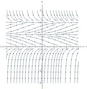 - A partir do campo de direção, podemos ver que todas as curvas de solução com p(0)>1 chegarão perto da assíntota horizontal p(t)=2 como t→∞. Portanto
