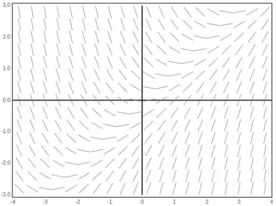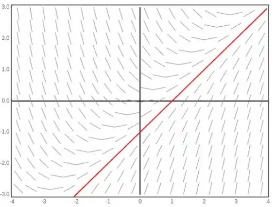 - Esboce a solução y=x−1, que é uma linha que passa pelos pontos (−1,0) e (0,1), no mesmo campo de direção. Observe que a solução segue as setas.