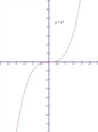 Se reparar bem, a diferença dessa curva para a de uma função do segundo grau se dá para os valores negativos de . Onde, diferente da função de segundo grau, o expoente ímpar não torna os valores positivos, fazendo assim a função decrescer em para .