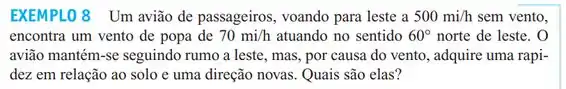 Qual velocidade e direção o avião no Exemplo 8 deve ter para que o vetor resultante seja 500 mi/h sentido leste?
