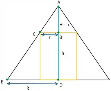 Assim, podemos desenhar a vista lateral do problema, chamando a altura e o raio do cone de H e R, e a altura e o raio do cilindro de h e r, temos: