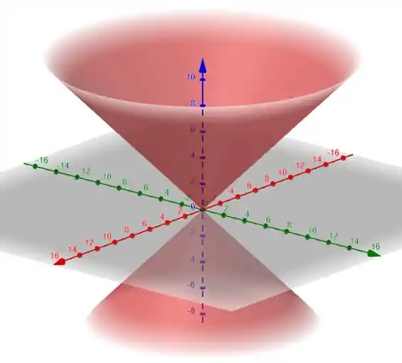Da discussão acima, a equação dada representa um cone circular reto de vértice , ao longo do eixo e com intersecção com o plano e nas duas retas e nas duas retas respectivamente.