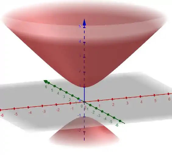 Da discussão acima, a equação dada representa um hiperbolóide circular reto de duas folhas, tendo os dois vértices (0,0,1) e (0,0,-1), ao longo do eixo e interceptando o plano e nos dois hiperbolóides e respectivamente. Portanto, o gráfico é mostrado abaixo