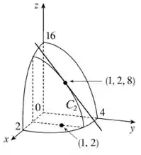 Perceba que na direção do eixo , a inclinação da superfície é de . Se nos movermos uma unidade positiva na direção a partir do ponto , a função diminuirá em unidades.