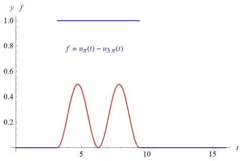 Abaixo está o gráfico de y(t) versus t sobreposto no gráfico de f(t) versus t.