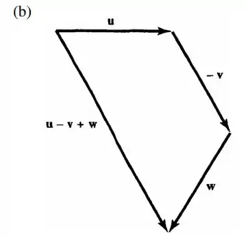 De forma similar, temos o vetor diferença u - v, do item anterior, e a partir da sua origem traçamos o vetor w. O vetor u – v + w é traçado com sua origem na origem de u, e sua extremidade na extremidade de w.