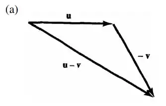 Dessa forma, traçamos de modo similar aos itens a e b, mas invertendo o sentido do vetor v para obtermos o vetor -v. Assim, temos o vetor u – v com sua origem na origem de u, e sua extremidade na extremidade de -v.