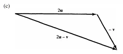 O vetor 2u é obtido ao multiplicarmos o comprimento do vetor u por 2, ou seja, dobrarmos o comprimento de u. O vetor -v é obtido invertendo o sentido de v. E o vetor pedido, 2u – v, é traçado com sua origem na origem de 2u, e sua extremidade na extremidade de -v.