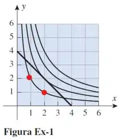 Observando as curvas, reparem que a primeira curva passa pelos pontos (2,1) e (1,2), esses são nossos menores pontos, eles que resultam em que é o nosso valor mínimo.