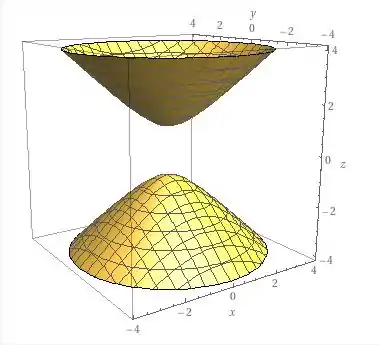 Então, a superfície que queremos é um hiperbolóide de duas folhas. Se liga aí no desenho dessa superfície: