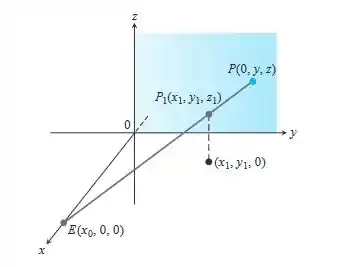 Perspectiva em computação gráfica - Em computação gráfica e desenho em perspectiva, precisamos representar objetos vistos pelo olho no espaço como imagens em um plano bidimensional. Suponha que o olho esteja em , conforme mostrado aqui, e que desejamos representar um ponto como um ponto no plano . Fazemos isso projetando no plano com um raio a partir de E. O ponto será representado como o ponto . O problema para nós, como designers gráficos, será encontrar e , dados e .