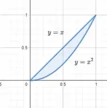 Esta questão nos pede para calcular o volume de um sólido de revolução em torno de um eixo específico. Aqui, nós temos uma região entre duas funções dadas e ao rotacionar isso forma-se um objeto com uma simetria que nos permite calcular o volume através de 2 métodos, que podem ser mais ou menos convenientes dependendo do que está querendo fazer. Sendo estes, o método dos discos circulares e o método dos anéis circulares. A região que o enunciado nos dá é a seguinte:
