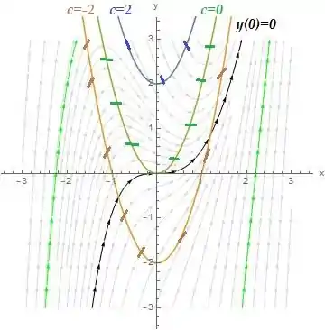 parábolas que é aberta para cima com vértice em (0,−c). No gráfico a seguir veremos a solução que satisfaz a condição inicial y(0)=0, e algumas outras soluções e isóclinas que correspondem a c=0,±1: