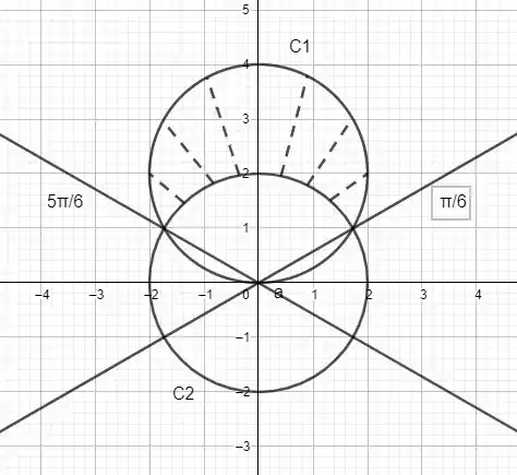 Olá galera! Para resolver esta questão precisamos encontrar dois intervalos: primeiro, o intervalo onde o raio varia e segundo, o intervalo onde o ângulo varia. É claro que o esboço desta região polar nos levará a encontrar os dois intervalos procurados. Segue o esboço desta região (os círculos determinados por e foram chamados de C1 e C2 respectivamente):