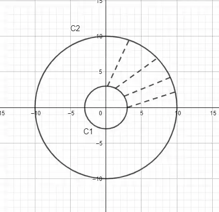 Dê uma olhada no esboço da região que esboçamos. Percebeu que a região procurada está entre os raios dos círculos C1 e C2, e sendo assim, podemos concluir que