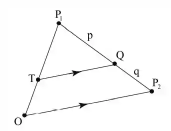Escolhemos T em de modo que é paralelo a , assim tendo o triângulo TP1Q semelhante ao triângulo OP1P2. Então temos que: