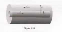 Um cabo coaxial consiste de dois tubos cilíndricos muito longos, separados por material isolante de suscetibilidade . Uma corrente I passa pelo condutor interno e retorna ao longo do externo; em cada caso a corrente se distribui uniformemente sobre a superfície (Figura 6.24). Encontre o campo magnético na região entre os tubos. Como verificação, calcule a magnetização e as correntes ligadas, confirmando que (juntamente, é claro, com as correntes livres) elas geram o campo correto.