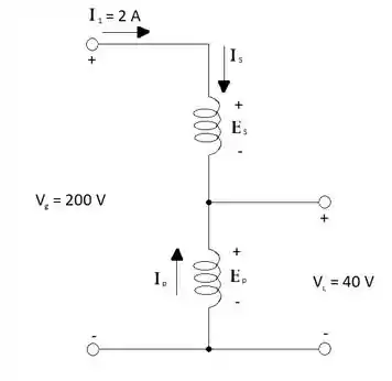 Calcule as tensões no primário e no secundário e as correntes no autotransformador visto na Figura 21.65.