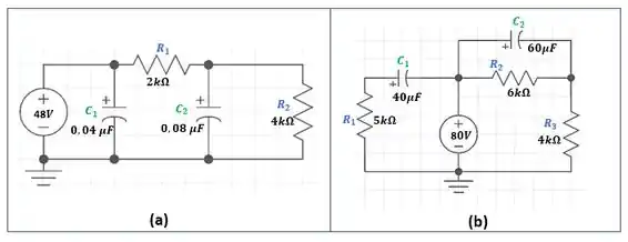 Para os circuitos mostrados na Figura 10.106, determine a tensão entre os terminais de cada capacitor e suas cargas após atingirem seu valor final.
