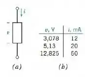Um componente linear é submetido a tensão v e uma corrente i como mostra a figura P 2.2-3a. Os valores da corrente i e da tensão correspondente v aparecem na figura P 2.2-3b. Represente o componente por uma equação que expresse m função de i. Essa é um modelo do componente. (a) Mostre que o modelo é linear. (b) Use o modelo para prever o valor de v correspondente a uma corrente de . (c) Use o modelo para prever o valor de i correspondente a uma tensão de .